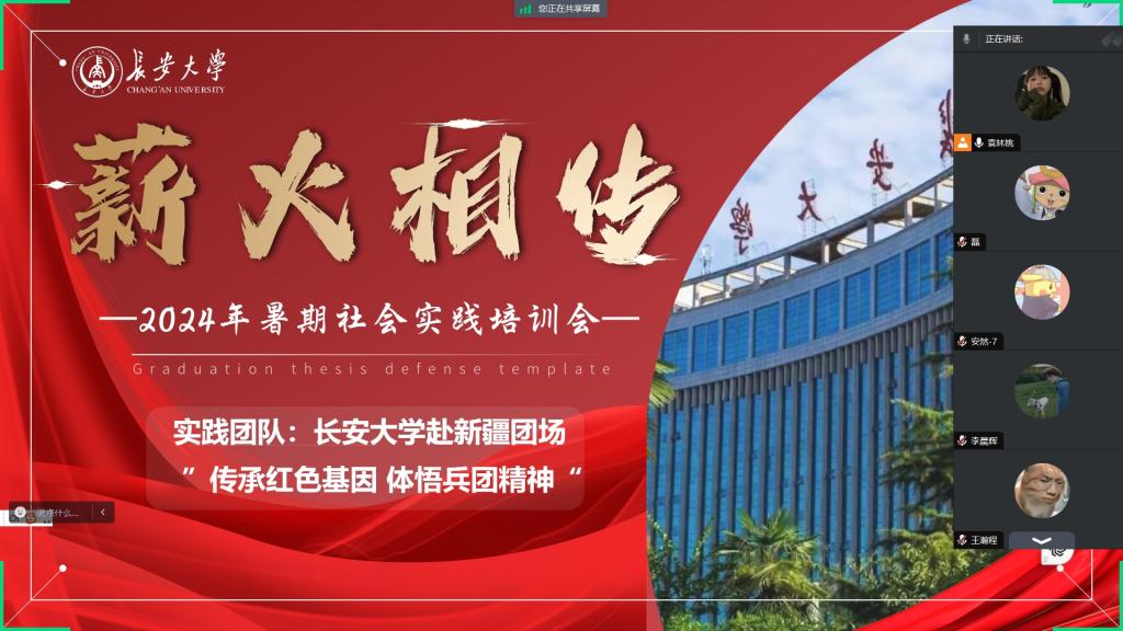 7月14日晚七点实践队在学生领队袁林桃的组织下开展了线上培训会,针对文稿撰写、外联等适宜进行分工,并对行程进行了详细的安排。为了增强培训的针对性和时效性,培训会还特别邀请了往年优秀实践团队代表丁光盛学长进行经验分享。他结合自身的时间经历,从分配、调研到成果展示等方面进行了详细的讲解,分享了宝贵的经验和教训,并对实践队遇到的问题和困惑进行了一一解答。