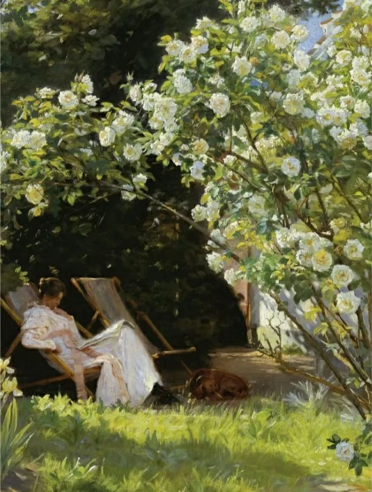 这幅《玫瑰》画面中描绘了在一个阳光明媚的日子里,身着白色长裙的画家妻子玛丽在玫瑰树下读书的场景。白玫瑰树花苞饱满,枝条粗壮,叶片浓绿。斑驳的阳光从树叶中泻下,照亮了茂密的草地。画面清新鲜亮,极富生活气息。