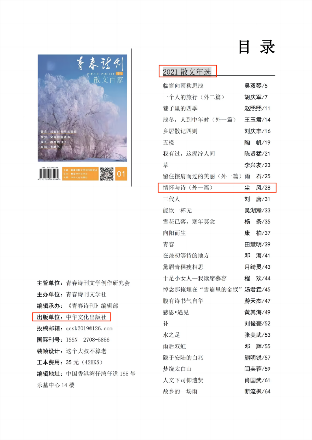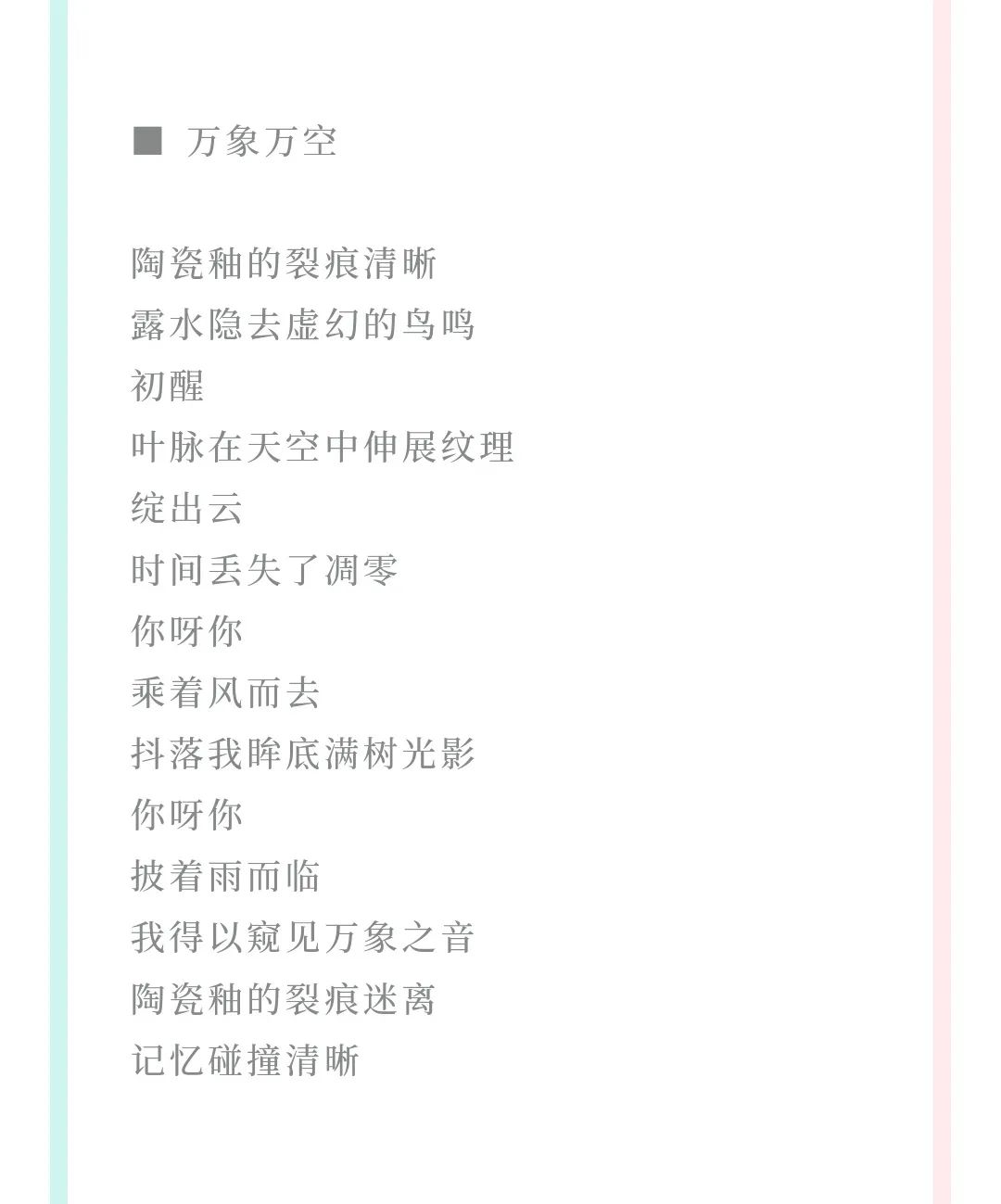 2021年6月,中国最优秀的公益性诗歌丛刊之一《青春诗刊》面向全国高校大学生发出征稿启事,他了解到后,心中的第一念头就是要把“长安”“文学”“青年作家”等诸多关键词带到更高更广的平台上去。于是,他潜心创作,不断打磨润色自己的文字。经过层层选拔,他以优秀大学生诗人身份入选其“大学生诗潮”专栏,同时,以长安大学为第一署名单位的6首参赛诗作在9月3日全部登刊(长安大学仅一名入选)。诗作《摆渡人》中的一句诗“远方除了遥远和你 / 一贫如洗”更是被选为该期经典名句。