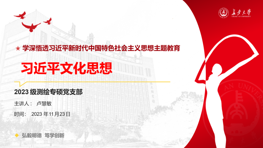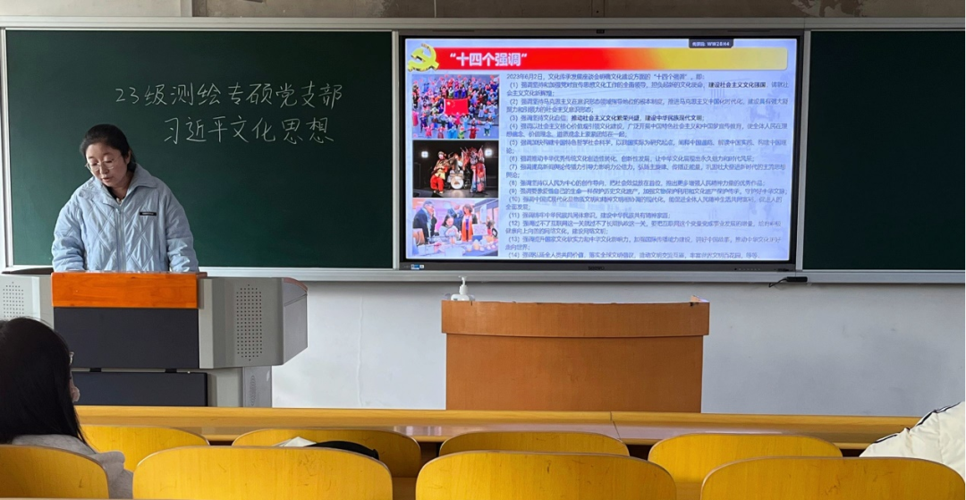 2023级测绘专硕党支部以“习近平文化思想”为主题,进行针对性学习。此次主题学习由党支部书记卢慧敏同志进行讲解,全体党支部成员参与学习。