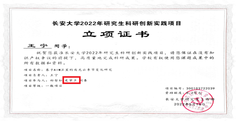 他参与的科研项目还有黄土与第四纪地质国家重点实验室开放基金项目(太阳活动对极地环境变化的影响研究),长安大学科研创新实践项目(基于AIM卫星的夜光云季节差异研究)。