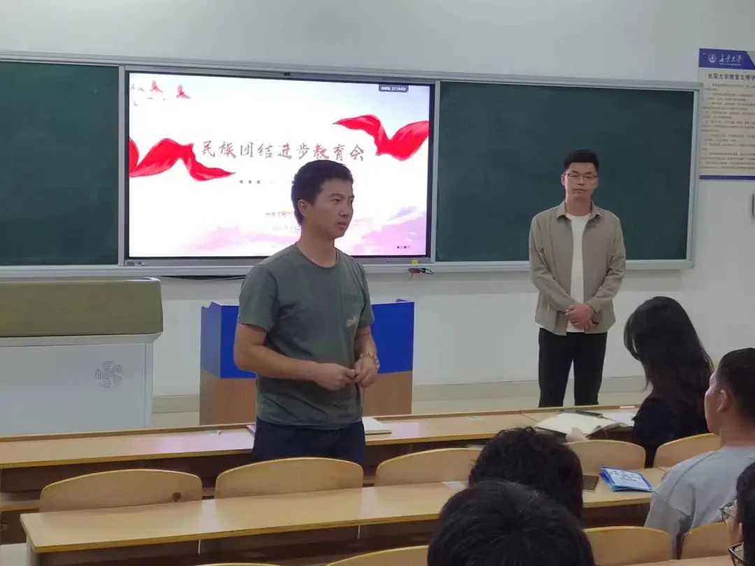 在WH2105开展“星辰下的石榴红”新生民族团结进步教育会。2023级辅导员杨东民、侯梦阳、2021级兼职辅导员王润涵以及40余名民族学生代表参加活动。