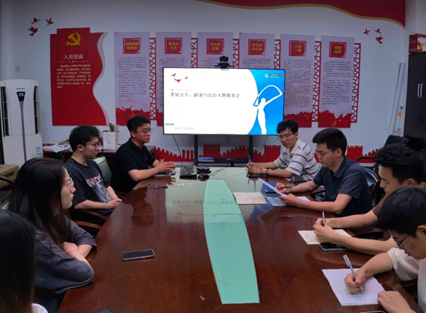 随后,刘文星老师开展了暑期安全,健康与法治主题教育会议,要求各党、团支部要积极组织各班统计暑期留校人员,并对研究生进行人身安全、财产安全、交通安全、实验室规范操作等方面的安全宣传和教育,增强研究生的安全意识、自我防范能力和自救自护能力。提醒大家离校和留校研究生均要提高个人安全防护意识,警惕网络电信诈骗、远离赌博传销活动。