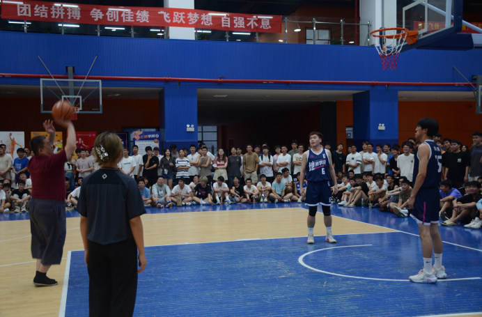 党委书记戴宏在中场休息期间走进球场投篮,一个接一个的进球引起全场观众的欢呼,场馆内的气氛也在戴宏书记的一个个进球中变得更加热烈。