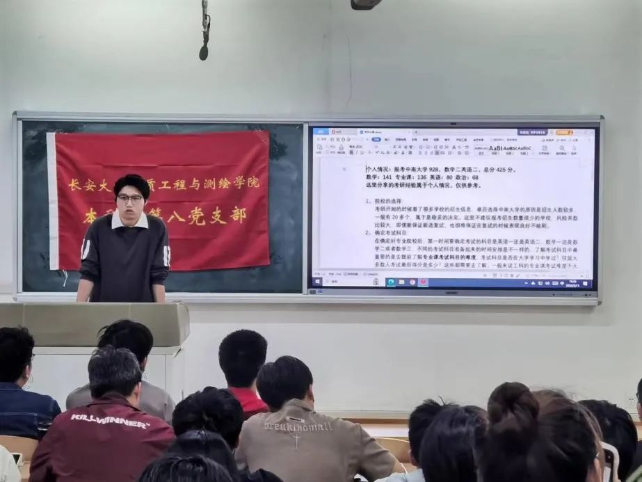 活动伊始,党委副书记潘迎介绍了此次主题党日活动的渊源、筹备和意义,并重点针对目前全党开展的主题教育进行了动员、安排与部署。随后,支部毕业生党员赵海峰、王智博、徐玉涵和边子策进行保研和考研经验分享。