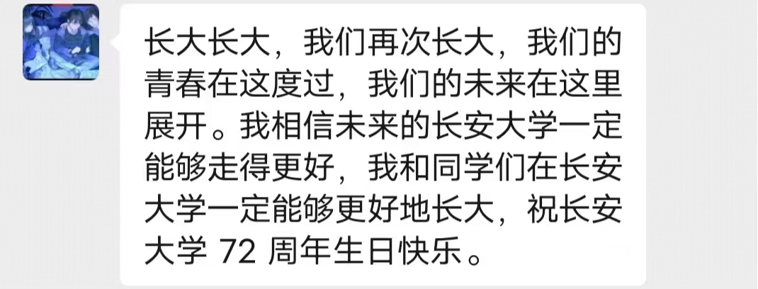 会议伊始,班长张超带领大家回顾了3月参观校史馆的内容,重述了学校的发展历史。并深情表白道:今天是长安大学成立72周年,寒来暑往,四时流转,愿我们能与长安大学岁岁年年,愿今天的我们以长大为骄傲,愿明天的长大以我们为骄傲!