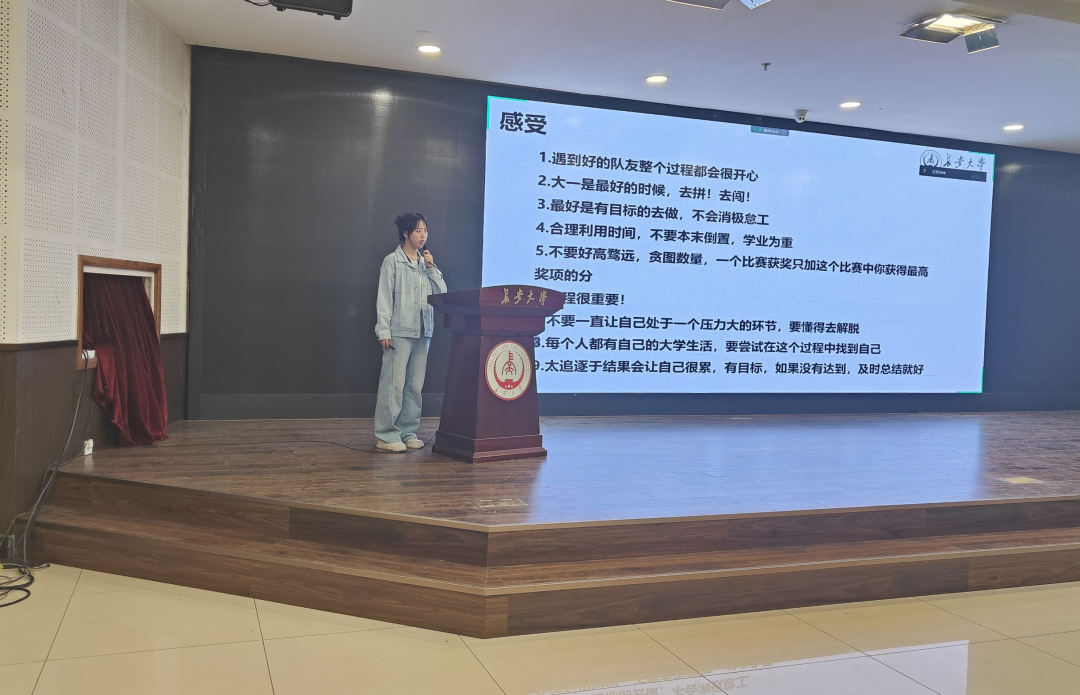 黄雨嫣就长安大学科创竞赛体系、重要赛事进程及参赛心得分享展开宣讲,首先对各大赛事进行了详致的介绍,并结合自己的竞赛经历对各项赛事作经验分享,接下来从个人素质、团队协作、学术能力、心理调节四个方面向同学们分享了自己独到的心得,最后以“科创先行,强国有我”八个字收场,给予同学们殷切的鼓励。