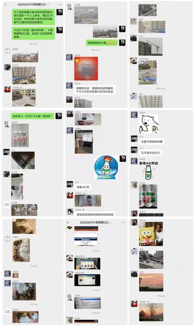 为了缓解同学们隔离期间“焦虑”心情、增添隔离“乐趣”,2020260701班开展了富有特色的“打卡”活动。班主任李宇白老师结合时事,每日设立不同的打卡主题,同学们在班群内分享所见所闻的趣事。隔离不隔爱,在这场没有硝烟的战争里,我们携手共进!