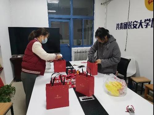 当天晚上,志愿者们把采购来的糖果、牛奶、水果等进行整理和分装。小小的福袋承载着沉甸甸的祝福,代表着全体支部党员对考研同学的祝福和期盼,除了糖果和牛奶,每个福袋中还有一个苹果和一个橙子。苹果披红香气扑鼻,寓意着“苹”步青云,橙子金黄灿烂如火,寓意着心想事“橙”。