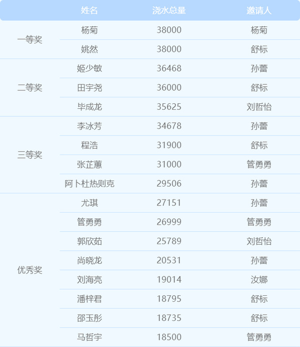 以下为获奖名单及其个人总浇水量: