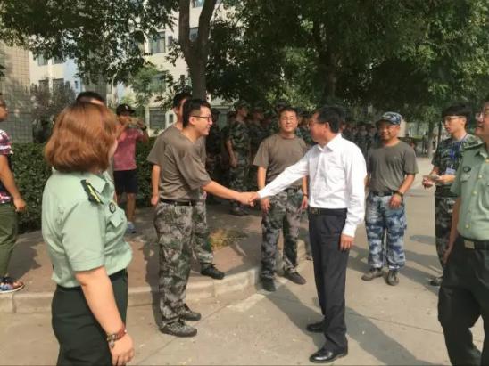 在艰苦的训练条件下,学院领导始终心系学生,与教官、辅导员一起坚守在训练场上。学院在八团训练地点设立服务帐篷,学院党委副书记滑思忠、辅导员邵龙、程耀等老师时刻守护在军训第一线,随时检查军训情况,并与学生交谈。