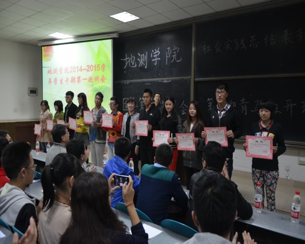 2014年暑期社会实践立项情况、开展情况以及完成情况,鼓励同学们积极参加社会实践,在实践中达到“受教育、长才干、做贡献”的目的。随后、邵龙、林泓宇老师为在本次暑期社会实践中表现突出的先进团队和个人颁发了荣誉证书。
