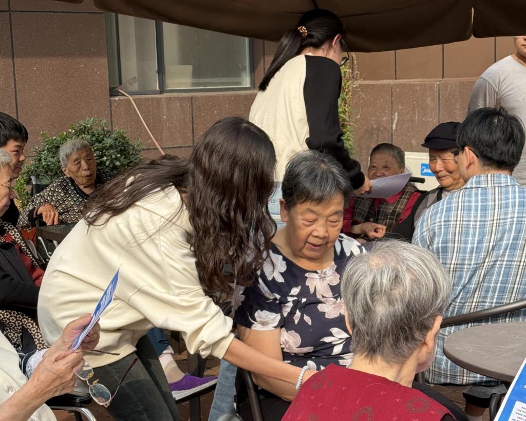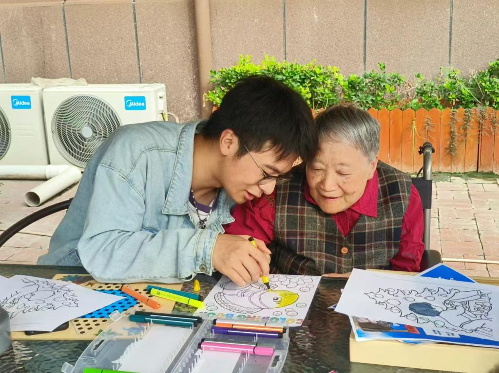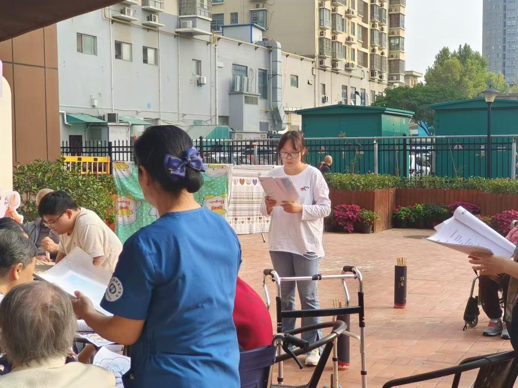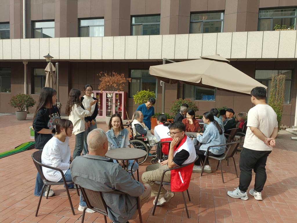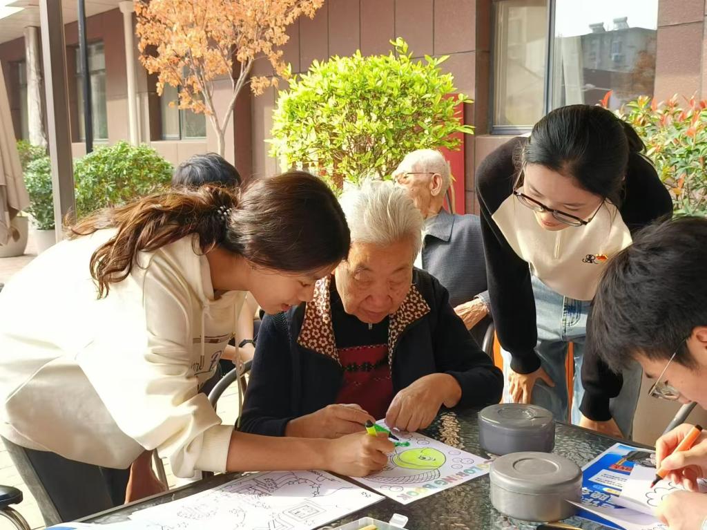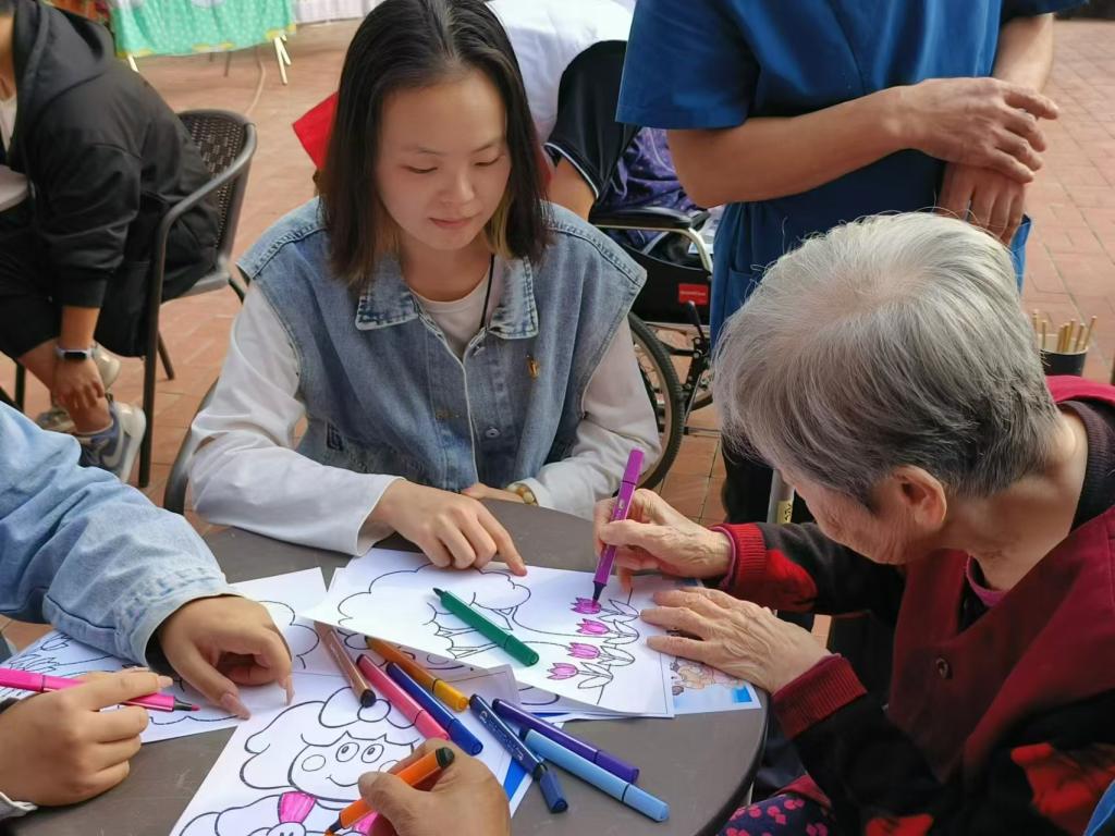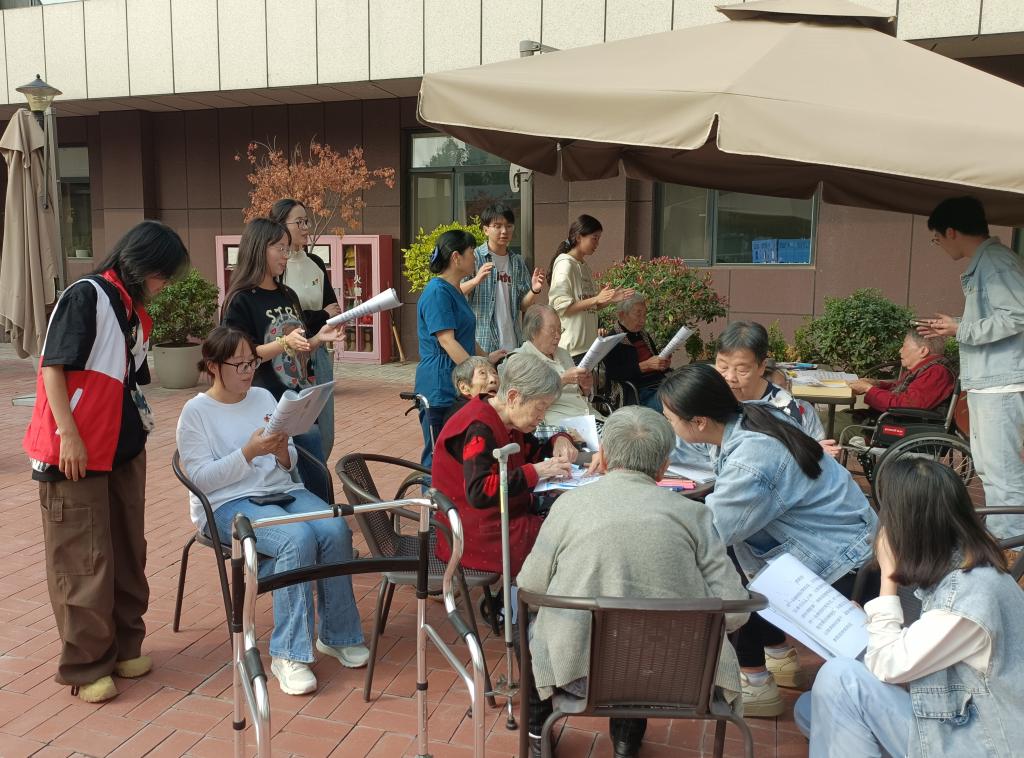 在医养院工作人员的带领下,同学们一一问候了在场老人,表达了对老人们深深的敬意和美好的祝福。同学们与老人相谈甚欢,一方面分享自己的大学生活,同时也聆听老人的人生故事,汲取他们的智慧经验。活动中,同学们为老人宣传反诈安全知识,帮助他们了解生活中常见的诈骗手段和信息,与老人共同唱老歌、做手工,以实际行动为老人带来精神上的慰藉,让老人体会到社会的关爱与温暖。