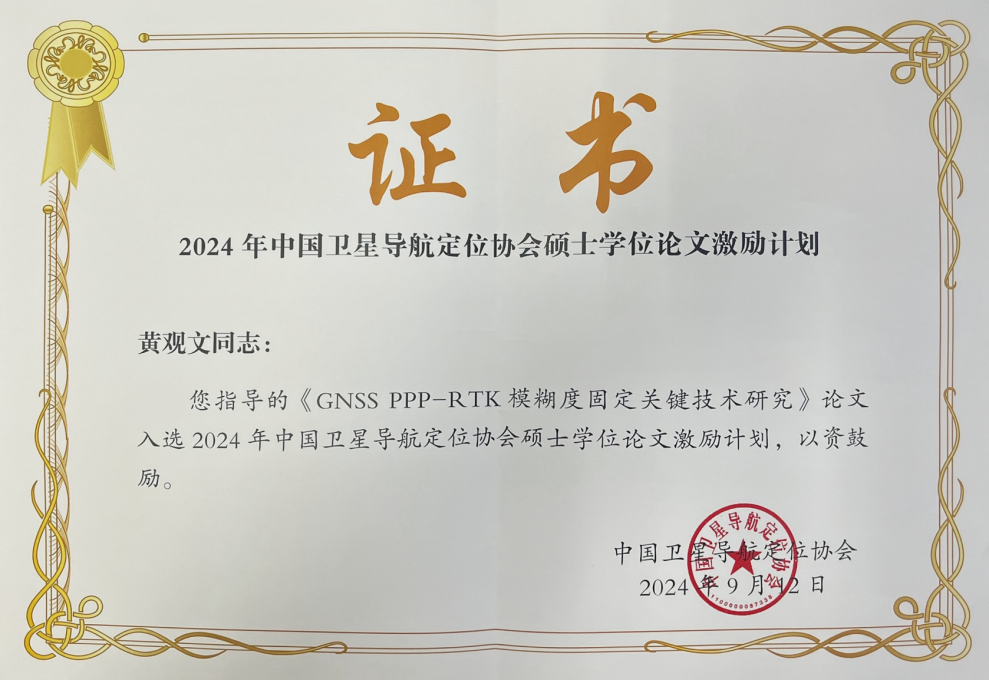 近日,经学位论文评审委员会终评,2024年度中国卫星导航定位协会论文激励计划评选结果出炉,本年度全国共评选出10篇优秀硕士学位论文,我校2022届硕士研究生杜石的学位论文《GNSS PPP-RTK模糊度固定关键技术研究》成功入选2024年度中国卫星导航定位协会硕士学位论文激励计划,指导老师为黄观文教授。