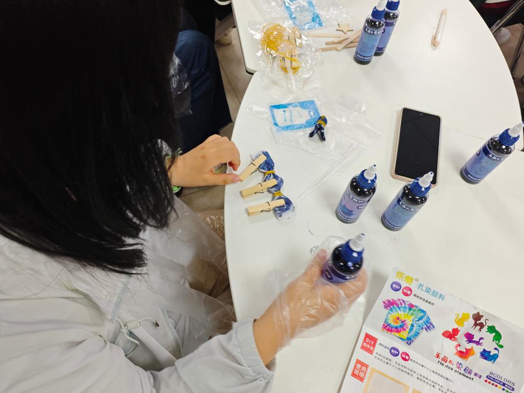 随后,同学们进入动手实践环节。在彩虹心理协会工作人员的指导下,同学们充分发挥想象力和创造力,将白色布料通过折叠、捆扎、染色等一系列步骤,赋予其独特的色彩与图案。大家全神贯注于手中的布料,沉浸在创作的乐趣之中,现场气氛热烈而融洽。