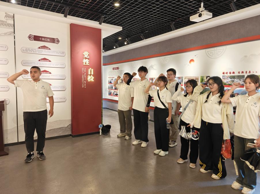 最后,团队前往青山镇长安大学党员党性教育基地,通过资料图片、文字记载以及人物故事学习红色事迹,感悟红色精神。在党旗前,指导老师杨海城带领团队成员重温入党誓词,以铮铮誓言砥砺初心,为意义非凡的首日实践画上圆满句号。