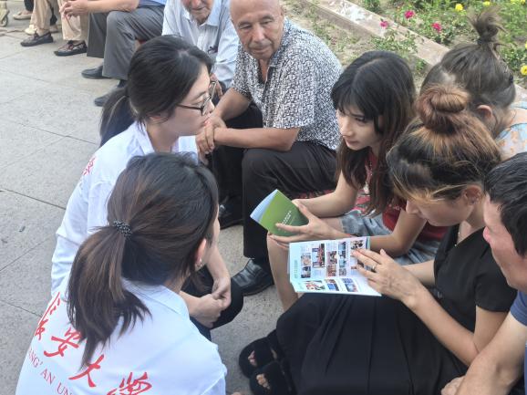 焉耆县作为多民族聚居地,语言交流在促进文化互鉴、社会和谐中发挥着关键作用。实践队通过政策宣讲、发放推普手册、趣味问答、舞蹈交流等多种形式,生动阐释了普通话作为国家通用语言的重要价值,即增进民族沟通的桥梁、传承文化基因的纽带、推动地区发展与融入国家发展大局的有力支撑。活动现场,各族群众积极参与,老少携手学习,从发音纠正到日常对话练习,互动场面热烈而温馨,展现了语言交流中加深情感联结的生动实践。