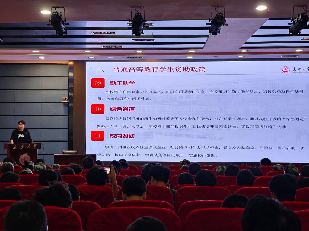宣讲会上,刘永旭围绕“普通高校学生资助政策”与“长安大学特色资助体系”两大板块进行了讲解。首先介绍了国家奖学金、国家励志奖学金、国家助学金、国家助学贷款、基层就业学费补偿贷款代偿等多项国家级政策的申请条件与评审程序。随后讲解了我校特色的资助项目,包括勤工助学岗位设置以及“长大标兵奖”、“长大卓越奖”、“长大优秀奖”等长安大学特色资助,全面展现学校“奖、助、贷、勤、补、免”六位一体的资助格局,传递“资助与育人相结合”的工作理念。