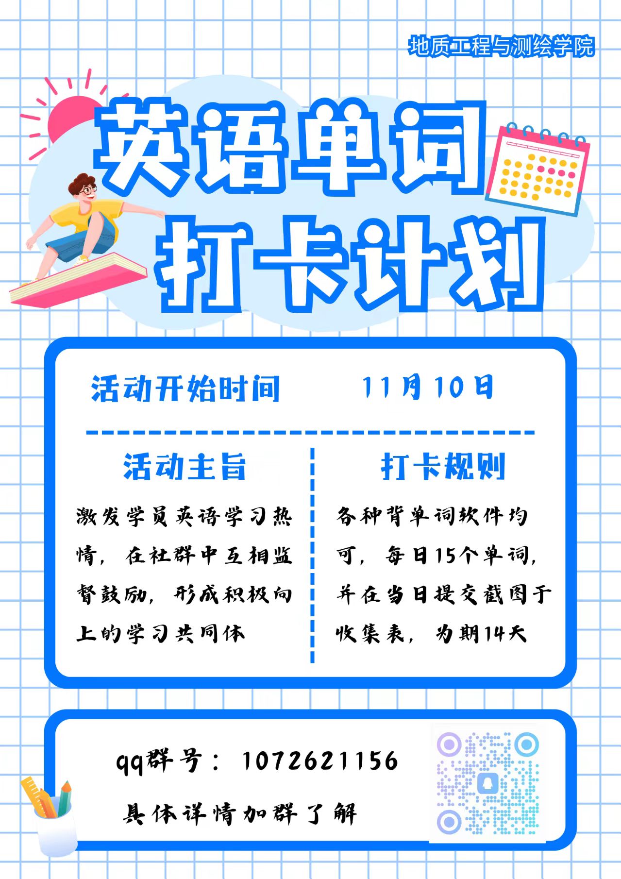 学生会暖心推出 “四级单词14天打卡活动” ,陪你一起高效利用考前关键期,集中攻克核心词汇,夯实基础,全力冲刺!