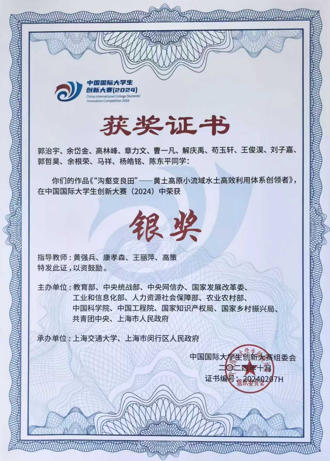 地质工程系学生团队凭借《沟壑变良田—黄土高原小流域水土高效利用体系》项目,经过激烈角逐,从全球514万个项目中夺得国家级银奖。本届大赛共吸引2083.6万人次报名,覆盖153个国家和地区的5406所学校,是我国级别最高、覆盖面最广、影响力最大的大学生创新竞赛。该项目团队成员由郭治宇(项目负责人)、余岱金、高林峰、章力文、曹一凡、解庆禹、苟玉轩、王俊淏、刘子嘉、郭哲昊、余根荣、马祥、杨皓铭、陈东平等14位同学组成,指导教师为黄强兵教授、康孝森副教授、王丽萍和高策老师。该团队作为本届大赛中长安大学唯一闯入全国决赛并荣获银奖的队伍,充分展现了太阳城网站备用网址导航