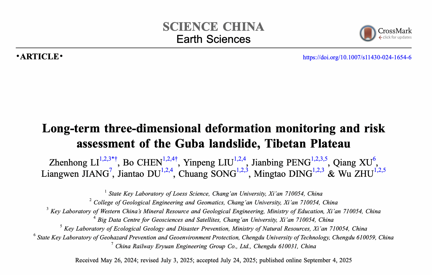 在国家自然科学基金重大项目(批准号:41941019)的资助下,长安大学李振洪教授团队与成都理工大学许强教授、中铁二院蒋良文副总工程师合作,在人迹罕至高位远程滑坡长时序三维监测和风险评估方面取得新进展。相关研究成果以“青藏高原古巴滑坡长时序三维形变监测和风险评估”为题,于2025年9月3日发表于《中国科学:地球科学》(Science China Earth Sciences)杂志,通讯作者为长安大学李振洪教授,共同第一作者为陈博博士。文章链接://doi.org/10.1007/s11430-024-1654-6.