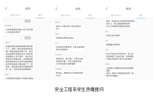 整个线上主题班会,同学们积极参与,就当前专业发展趋势和前景、自身发展规划、专业考研政策等问题,提出了自己的想法和疑问,安全工程系全体任课教师和热心的优秀校友进行了逐一的回答。
