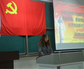 随后培训班班主任段少帅宣读《入党积极分子培训班课程安排》,班主任谢楠宣布《入党积极分子考核规定》。在学员代表任旭晨同学发言之后,资源学院党委副书记荆琳讲话。她表示入党积极分子应从思想上真正入党,在今后的学习生活中时刻规范自己的行为。讲话的最后,荆琳副书记表示,希望同学们通过本次培训能进一步学习党的知识,进一步端正入党动机,明确入党目的,经受党组织的考验。