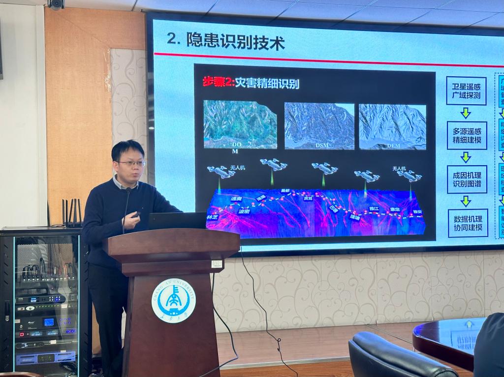 副院长朱武汇报了当前学院在“北斗+”交通灾害识别监测技术与装备方面的研究。分别从隐患识别、实时监测、风险预警、灾害典型应用四个方面作简要介绍。学院团队围绕地质灾害“长啥样-怎么找-怎么测-怎么防”进行团队布局,致力于服务国家重大科技需求和突破国际学术前沿。